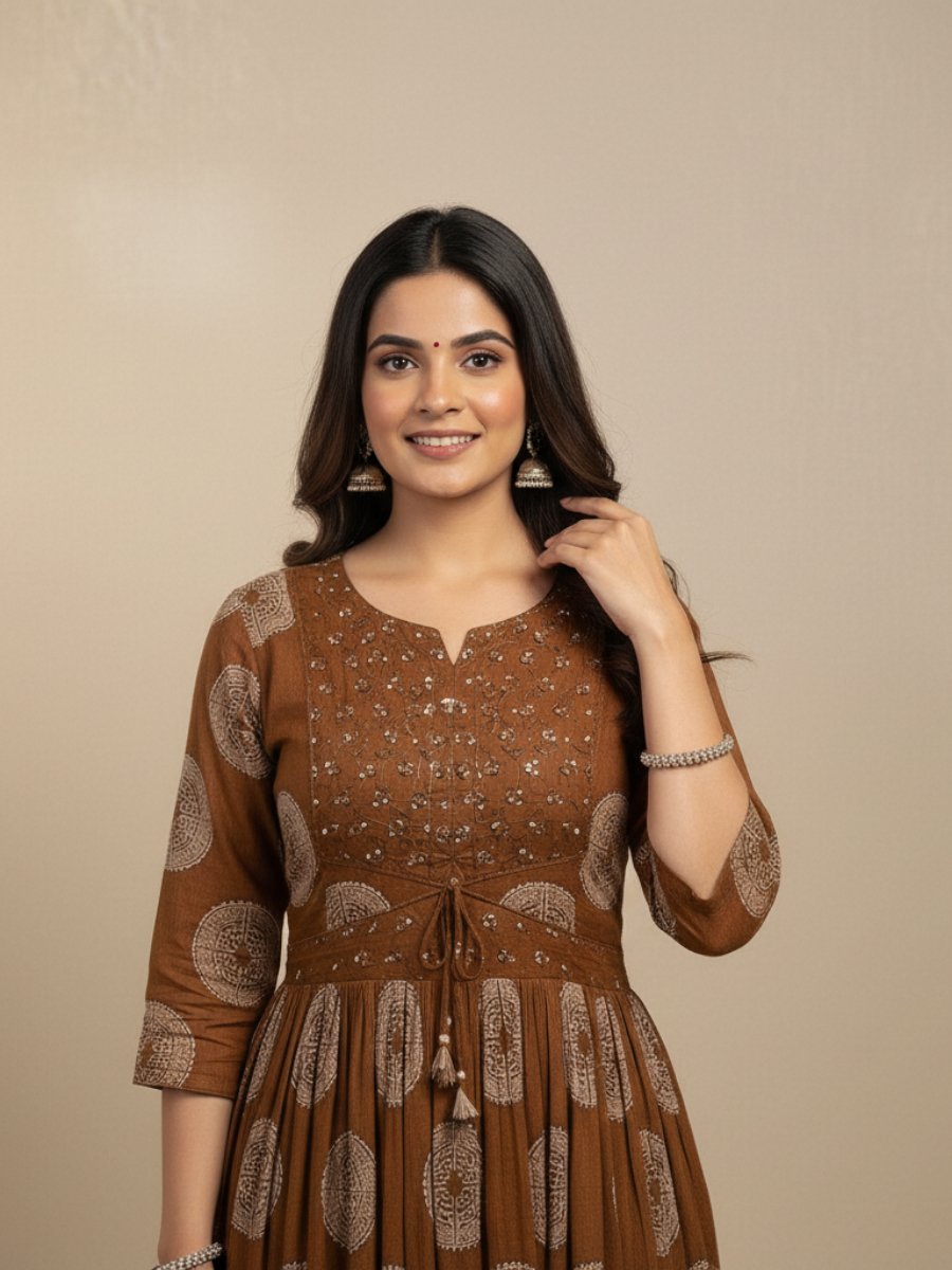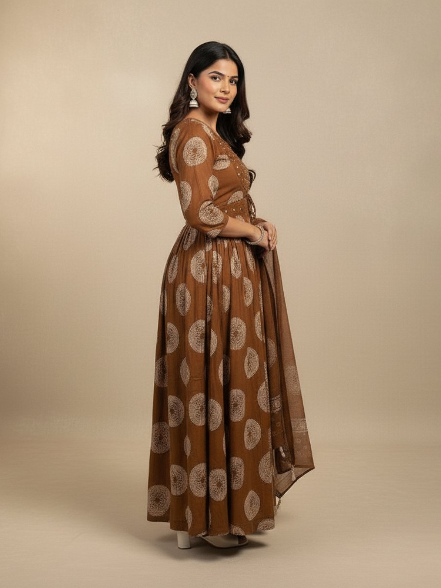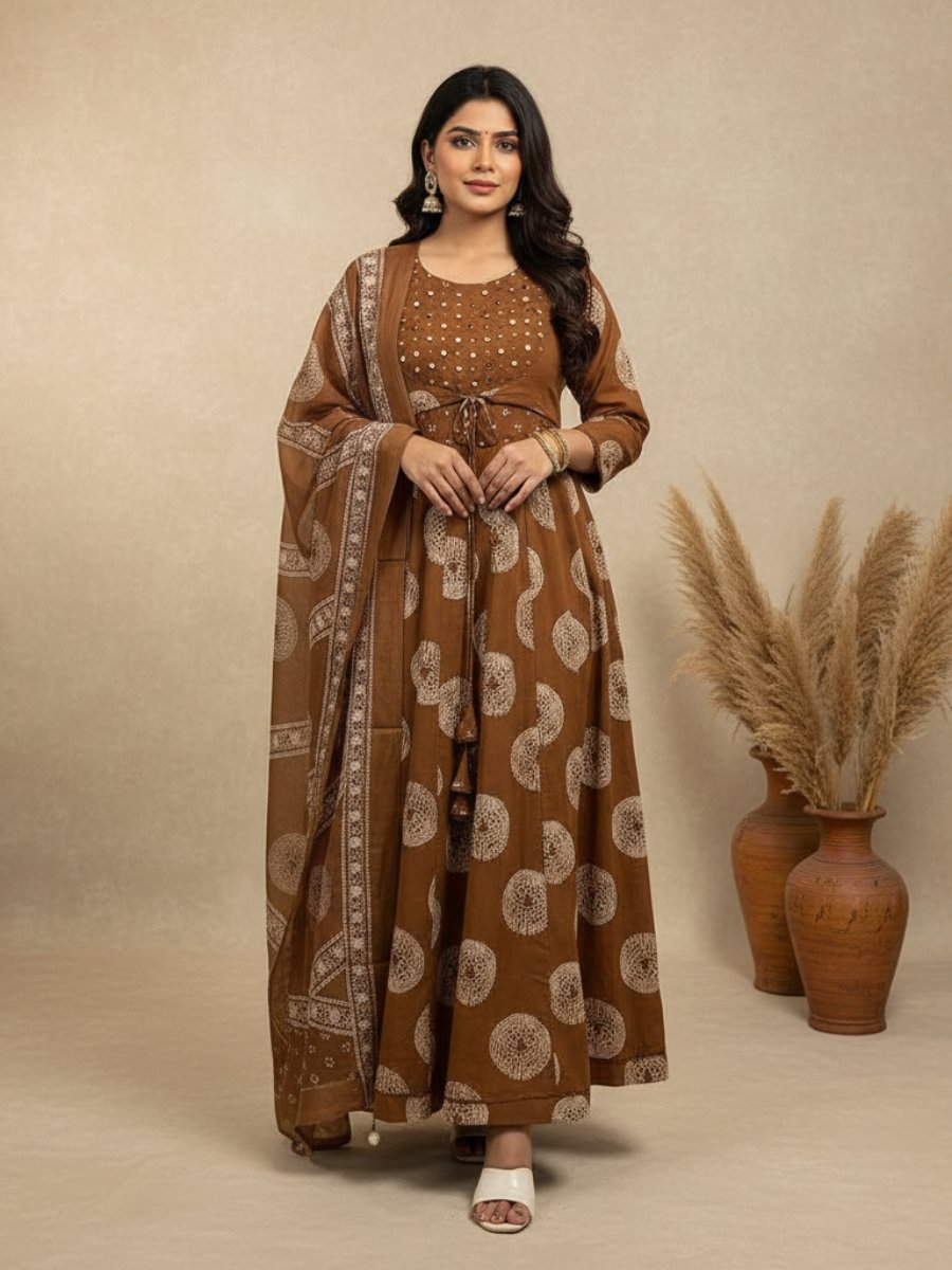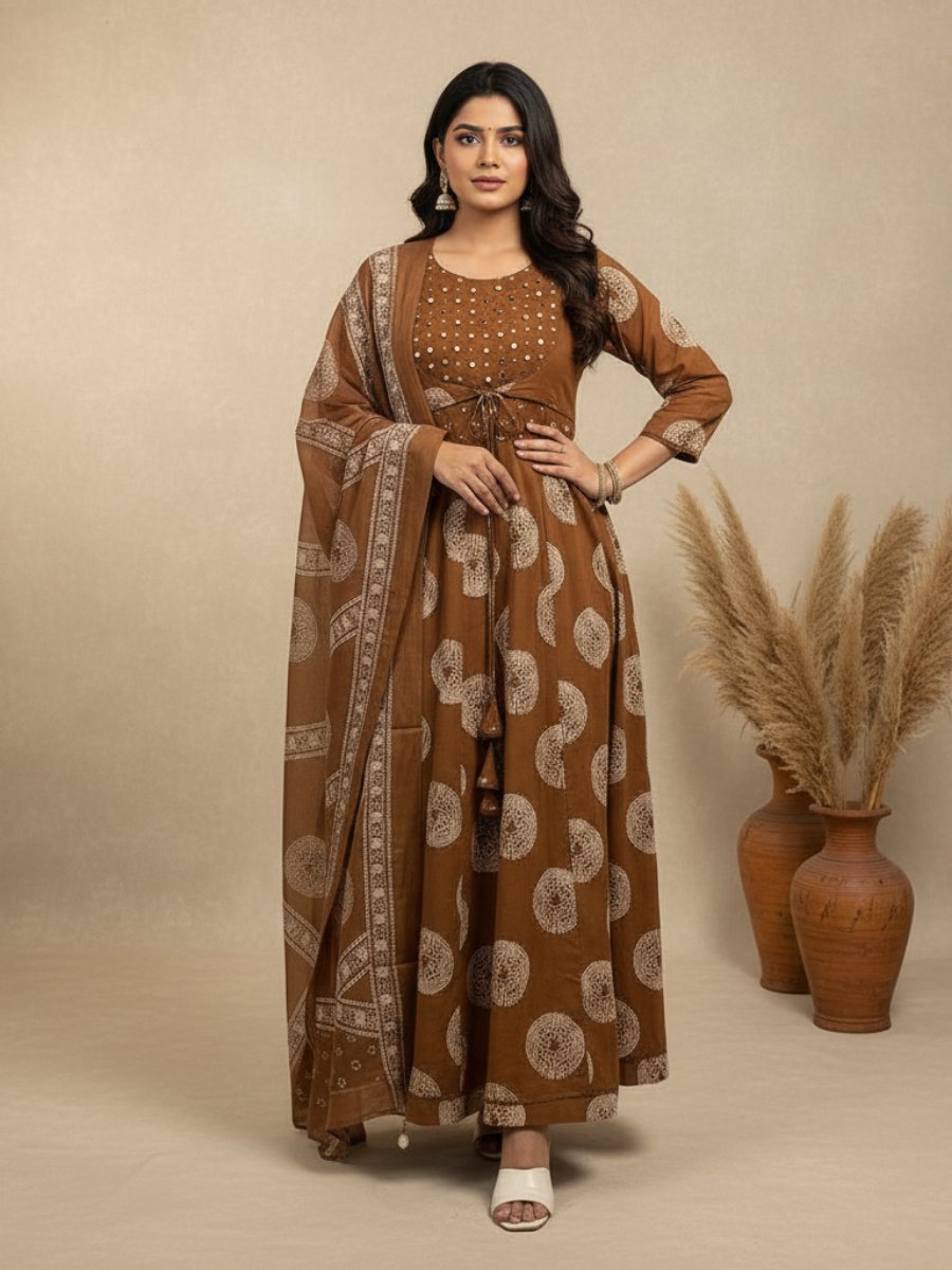 The Printed Cotton Anarkali Set: Mirror Moti Work & Shrug Style