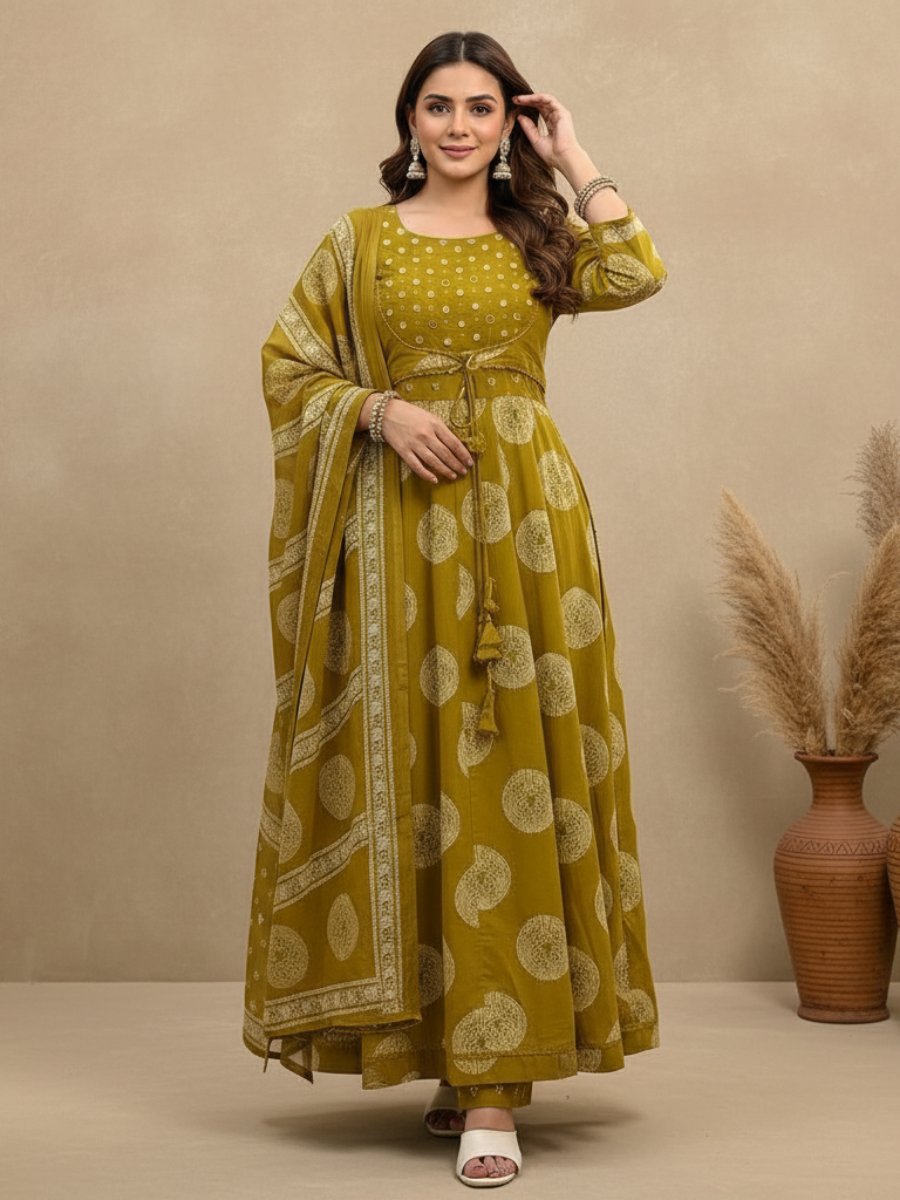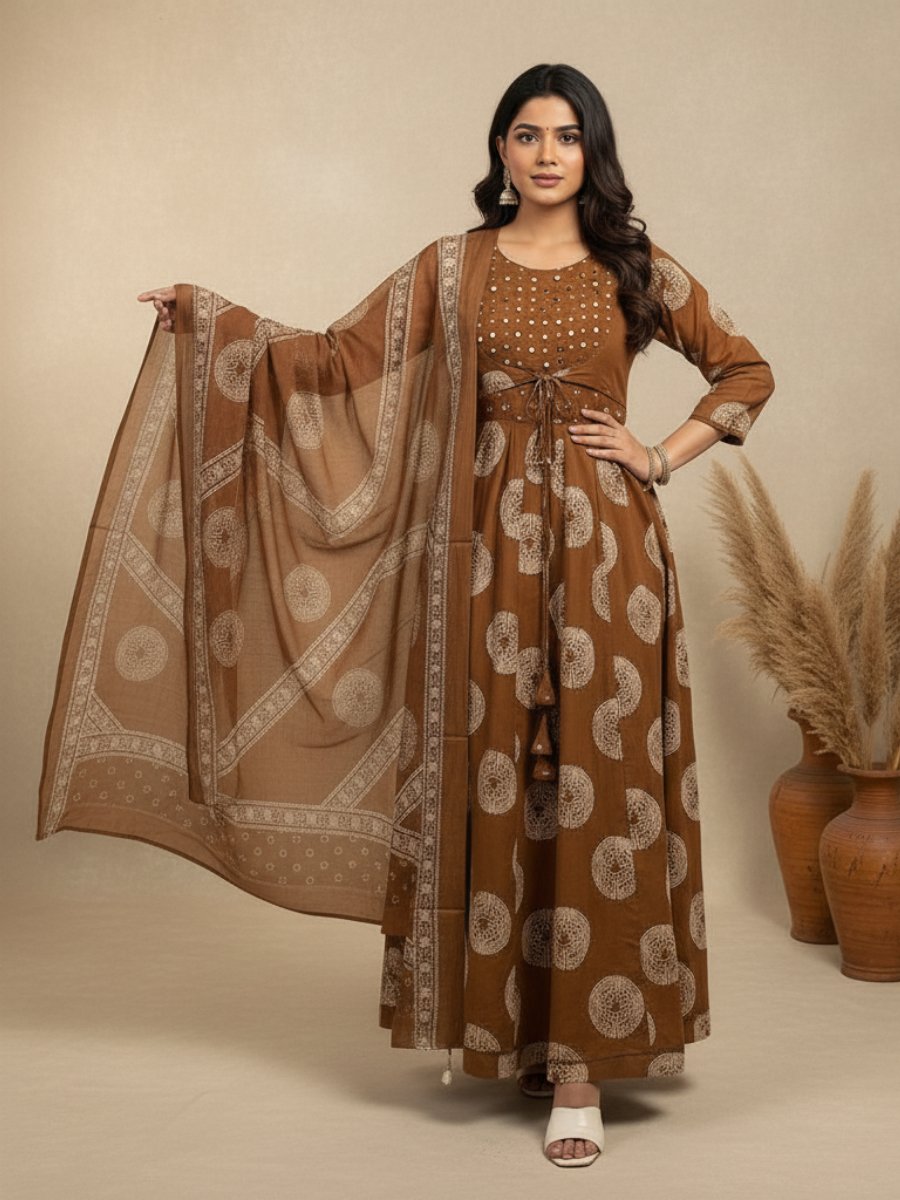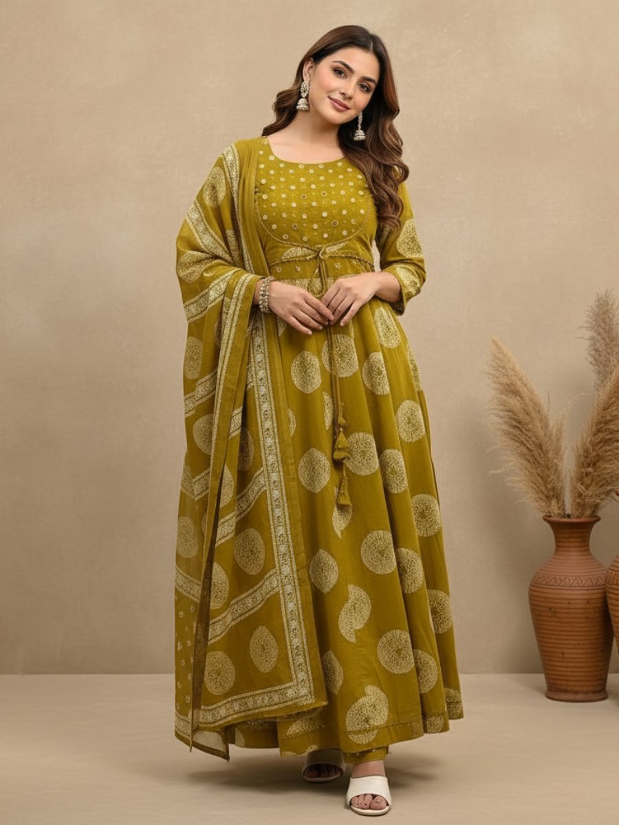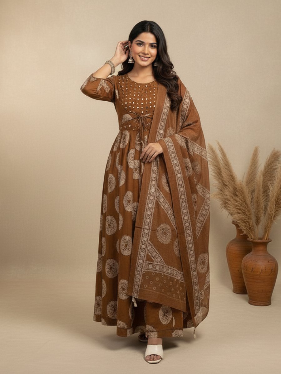 Introducing our New Launch collection: the perfectly Beautiful Printed and Embroidered Anarkali Kurta Dupatta Set. Crafted from soft, breathable Cotton, this 3-piece set is designed for the modern woman who seeks comfort without compromising on style during the casual festivities.