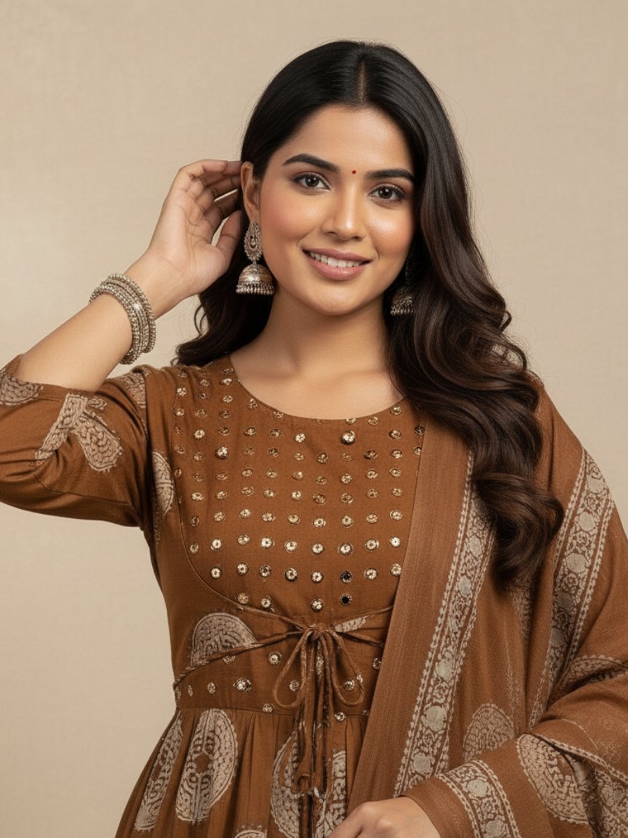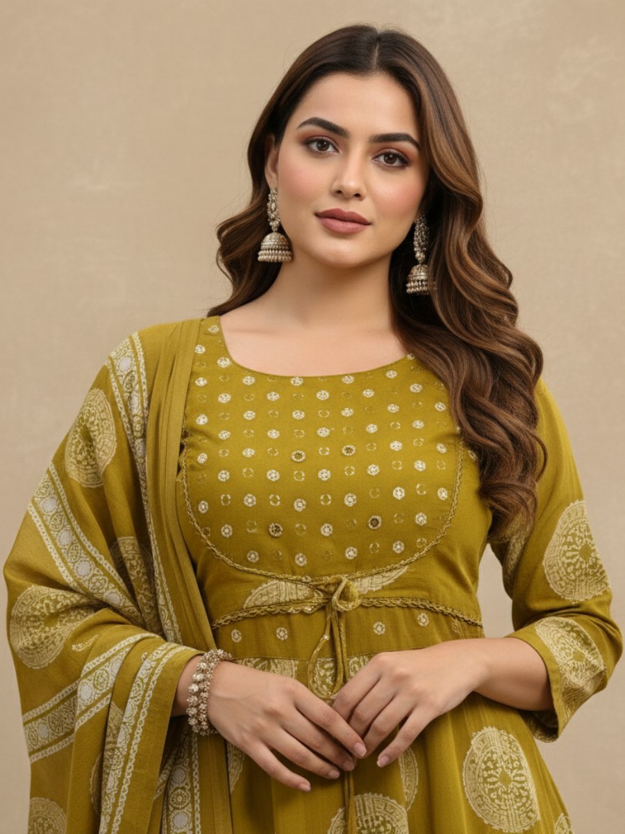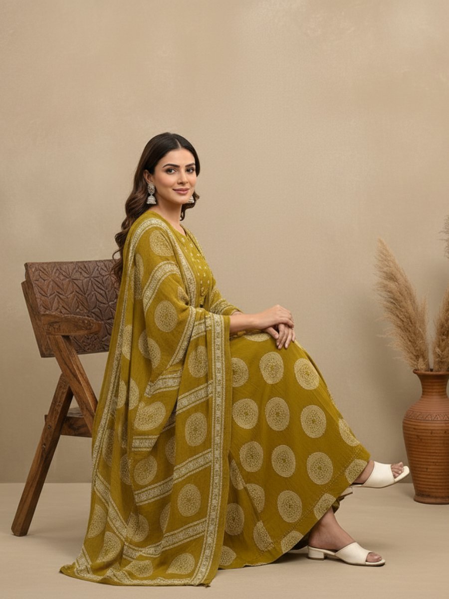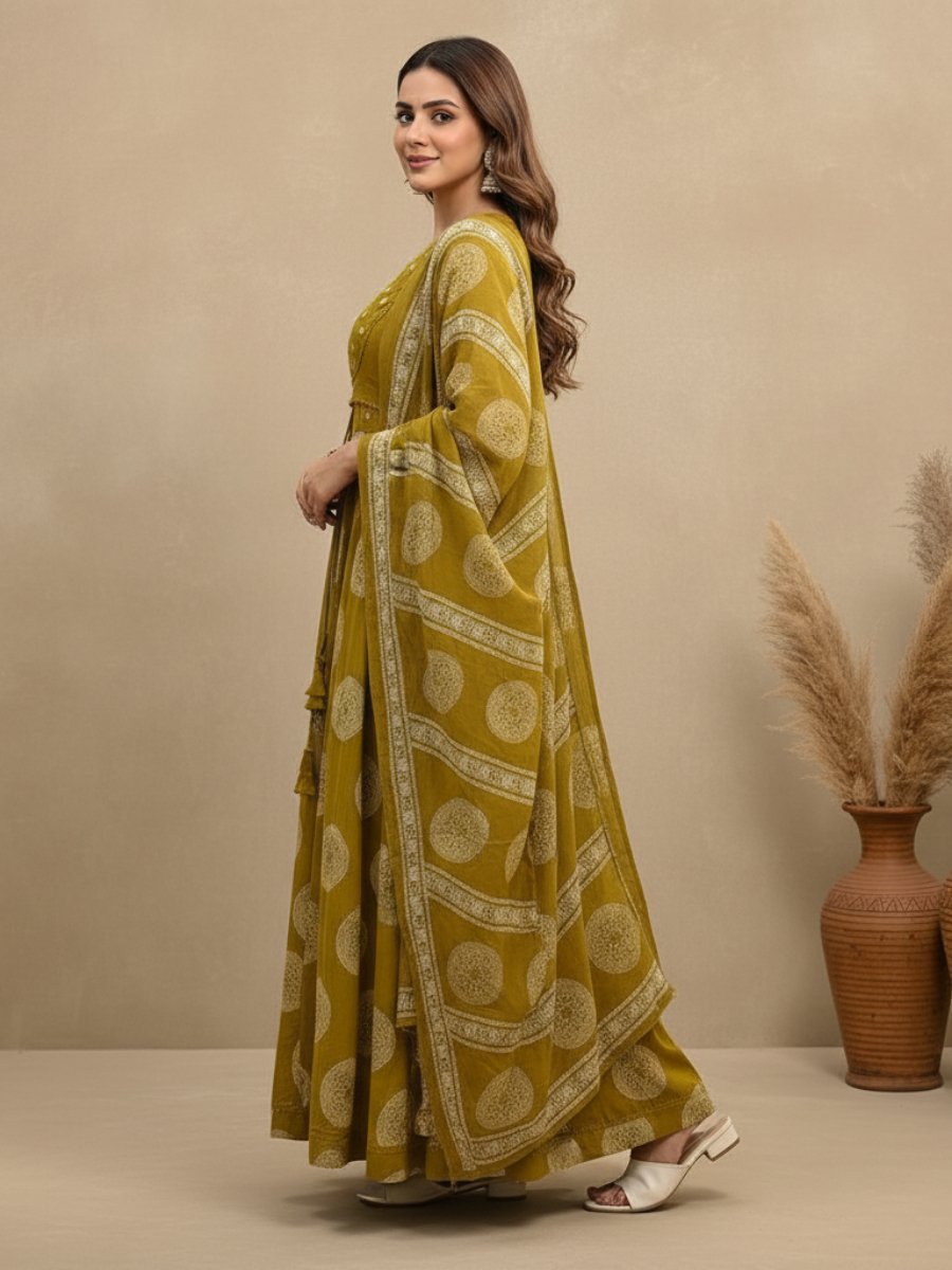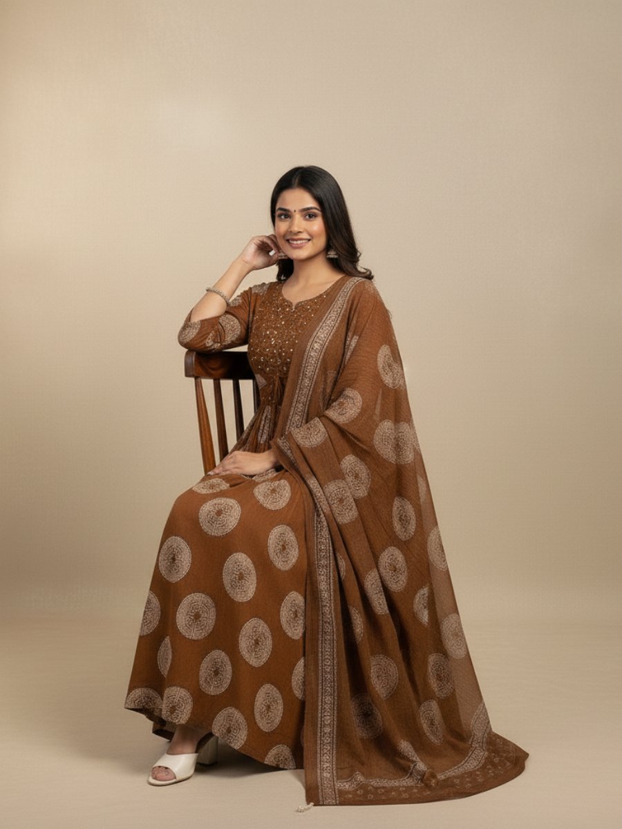 Introducing our New Launch collection: the perfectly Beautiful Printed and Embroidered Anarkali Kurta Dupatta Set. Crafted from soft, breathable Cotton, this 3-piece set is designed for the modern woman who seeks comfort without compromising on style during the casual festivities.