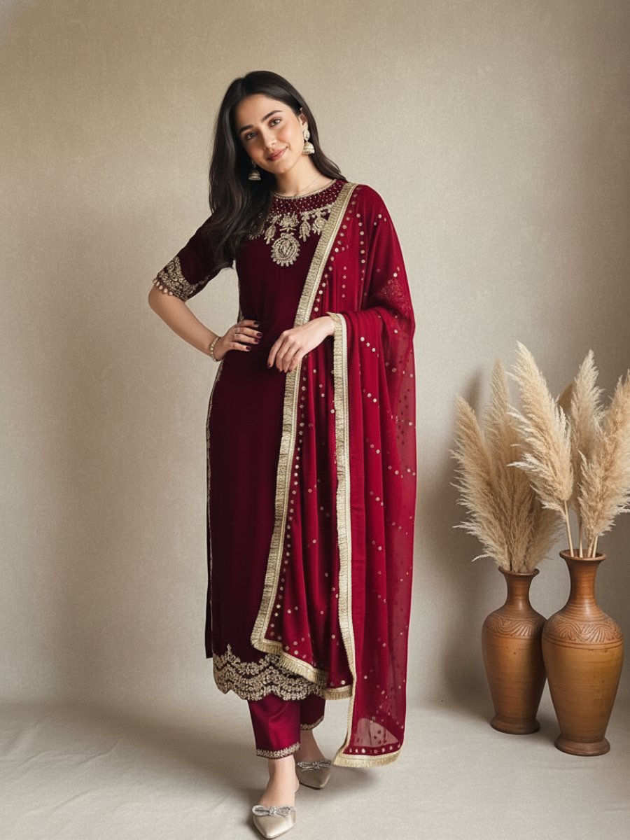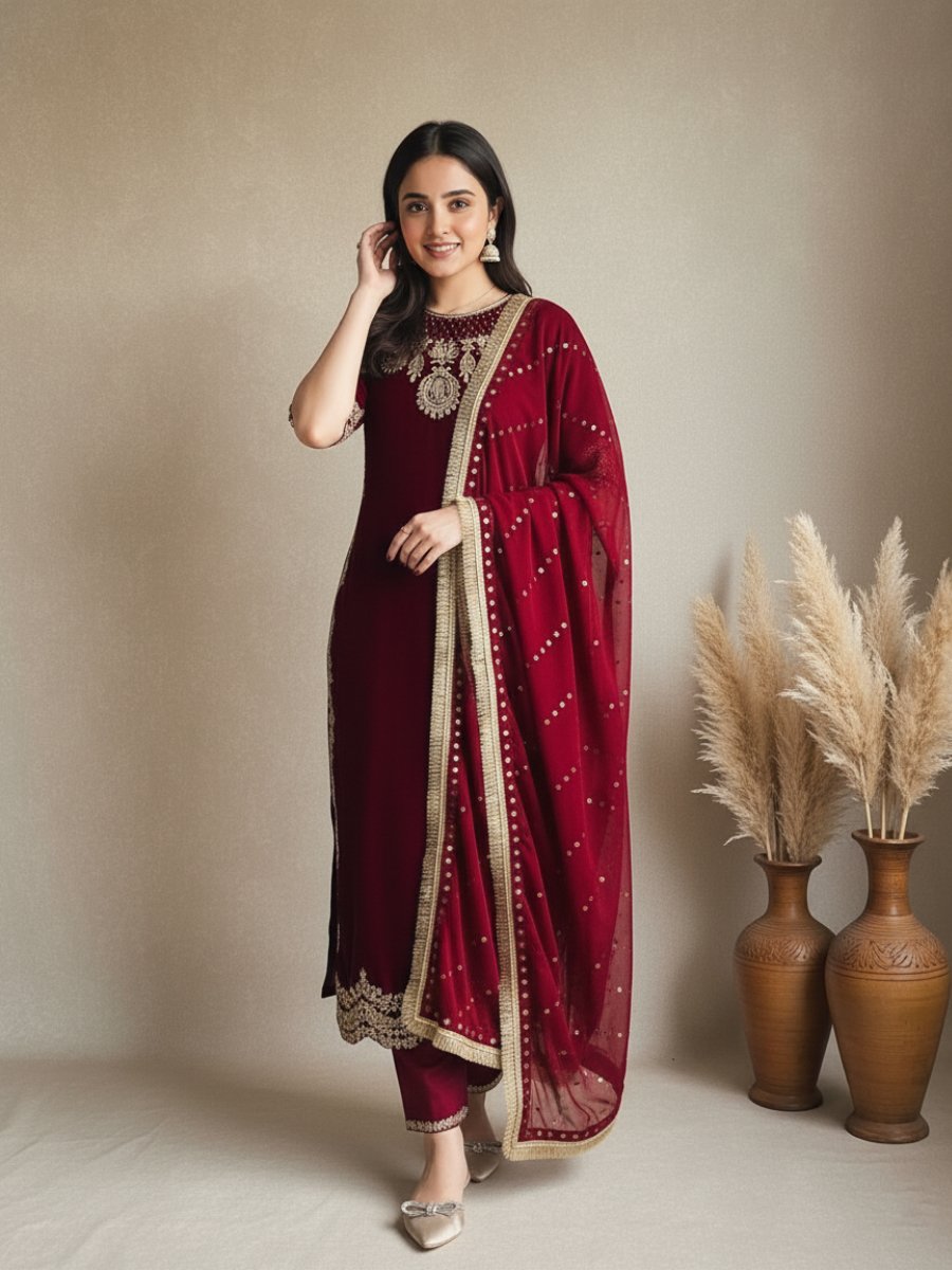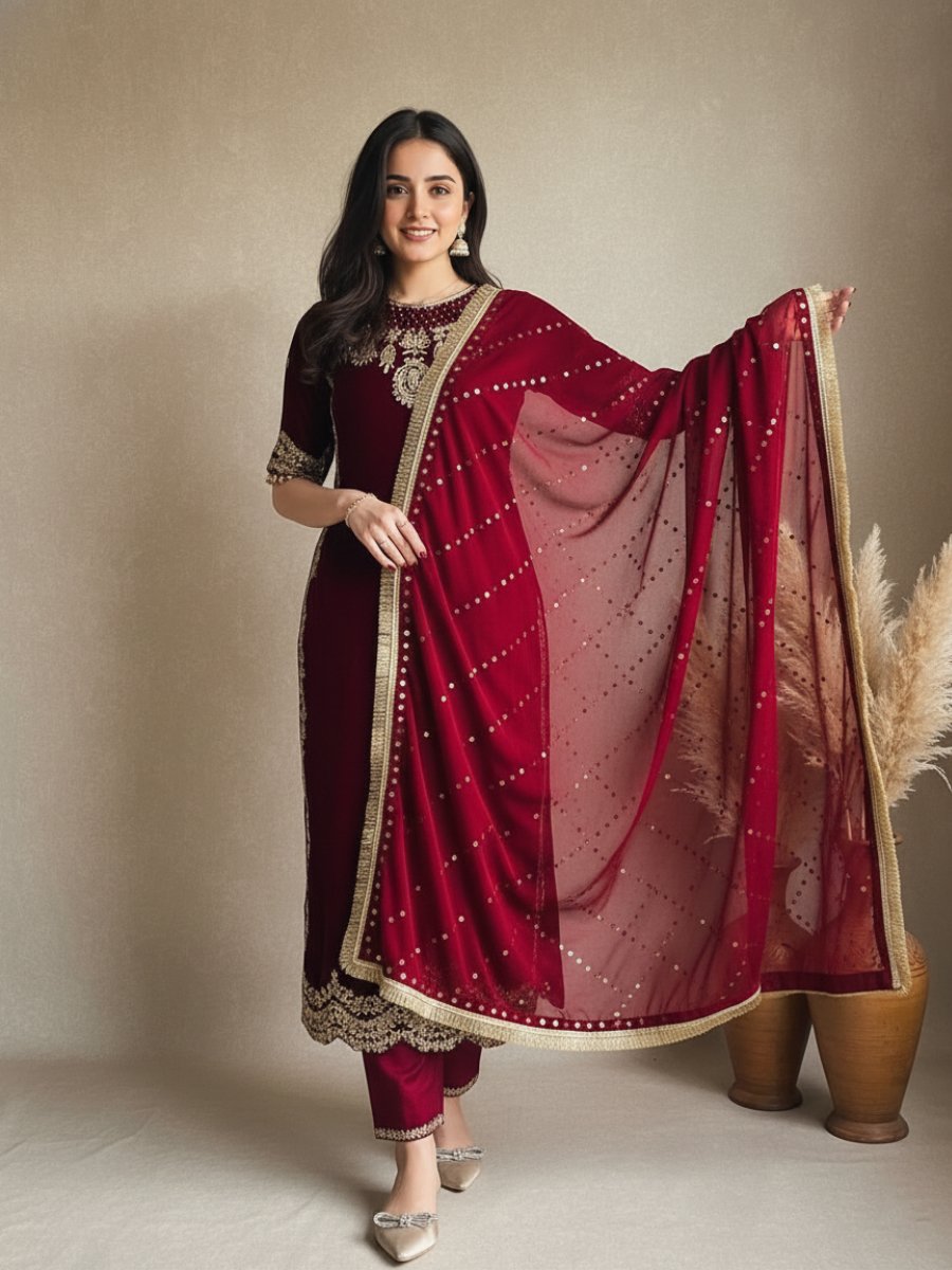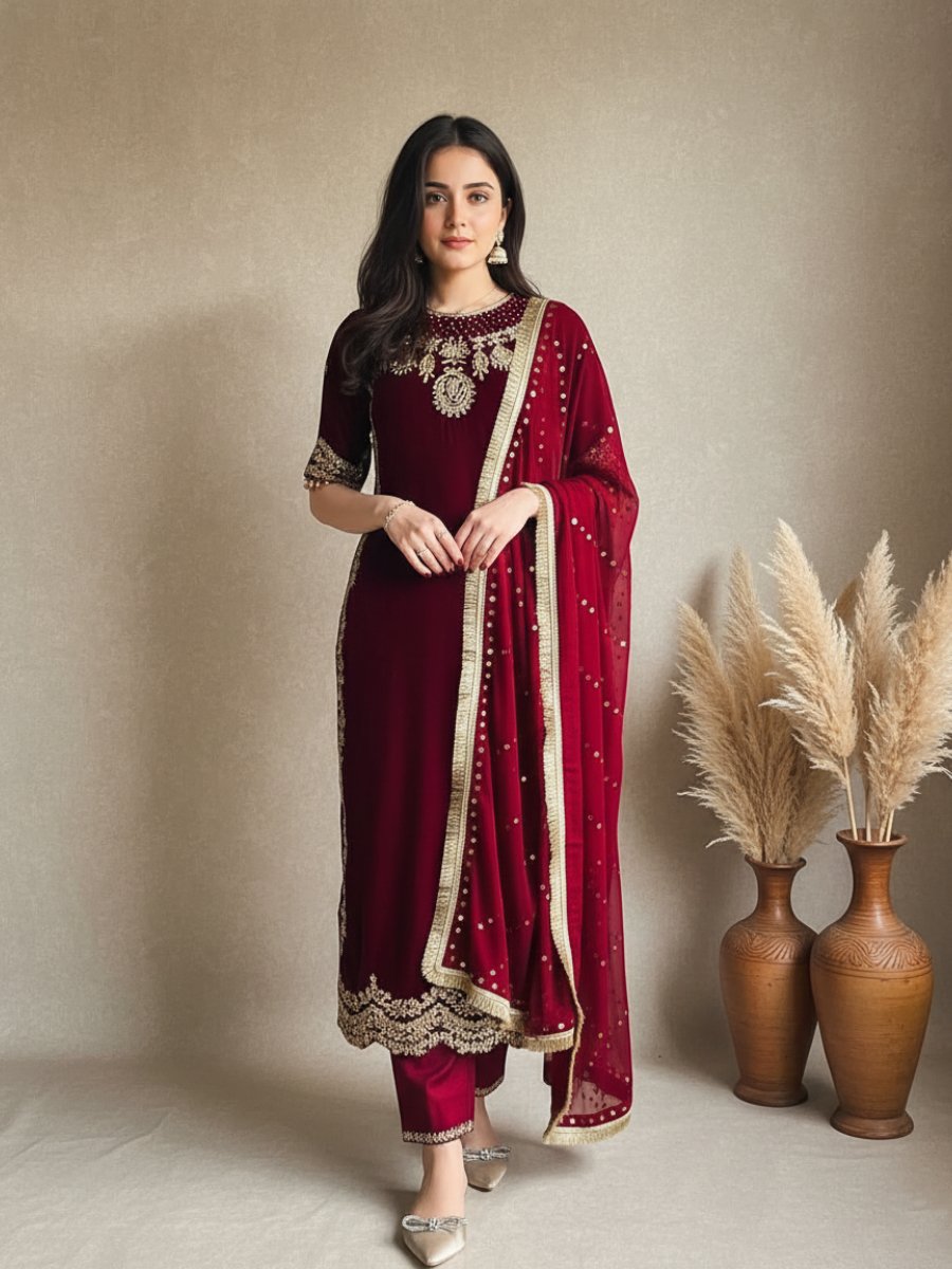 Make an unforgettable statement this wedding and festive season with our exquisite Velvet Suit Collection. This heavy 3-piece designer set is the epitome of elegance, featuring the rich, warm luxury of Heavy Viscose Velvet—the perfect fabric for winter celebrations.