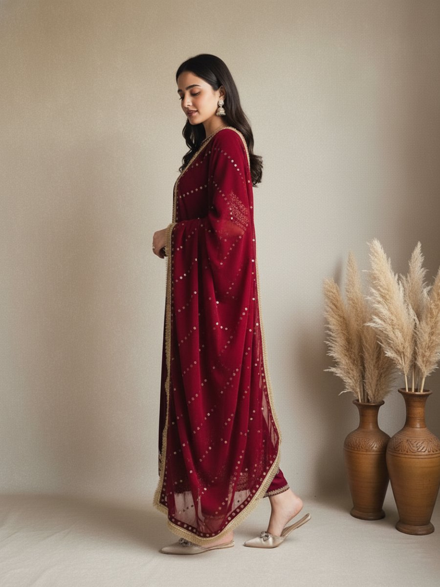 Completing this stunning outfit is the Heavy Georgette Dupatta. It features elegant Embossed Work and lace detailing, adding depth and richness to the overall look. The substantial weight of 1.3 kg confirms the superior quality and richness of the fabric and embellishments.