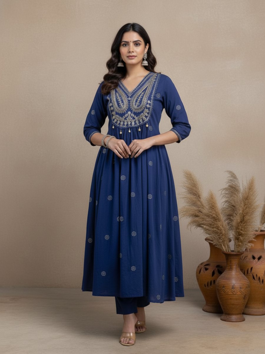 The flared Anarkali Kurti/Gown style provides a magnificent twirl-worthy silhouette. The yoke is richly detailed with beautiful Embroidery Sequence Work, adding a sophisticated shimmer that is ideal for party wear. The Kurti comes with a comfortable lining attached and is paired with a matching Cotton Pant.