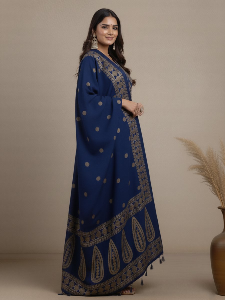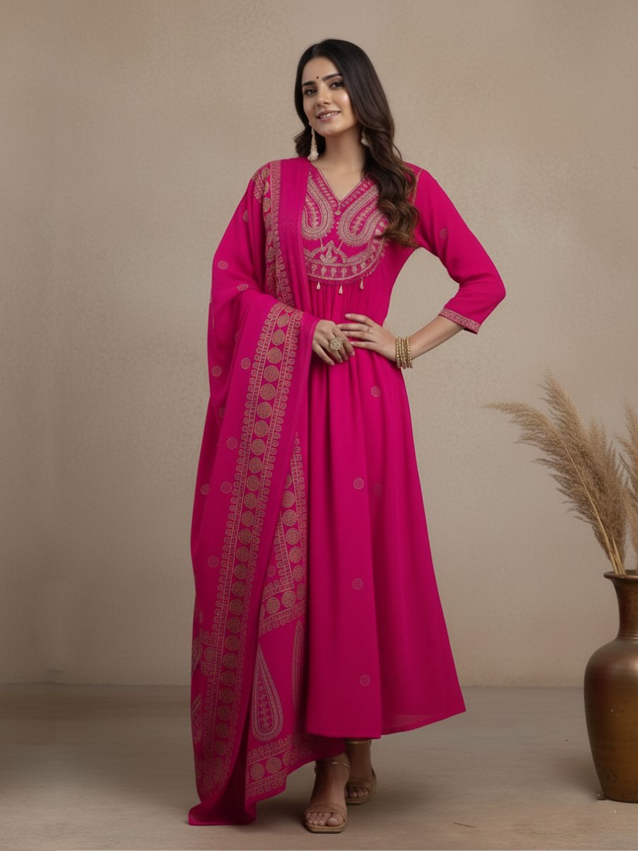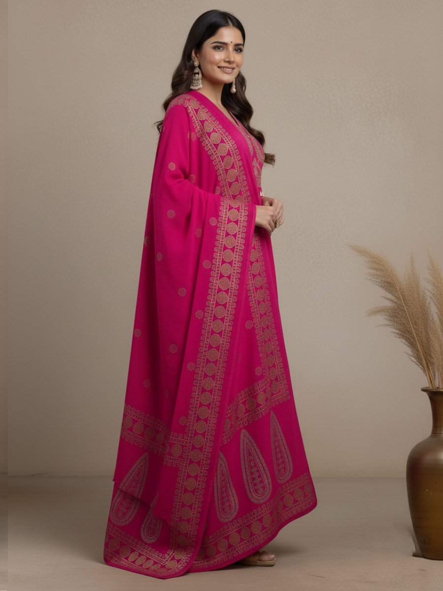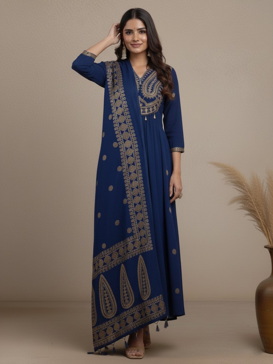 Completing the look is the Fully Printed Dupatta, featuring intricate traditional motifs (like the gold foil/paisley print) that perfectly complement the Kurti, creating a cohesive and opulent appearance.