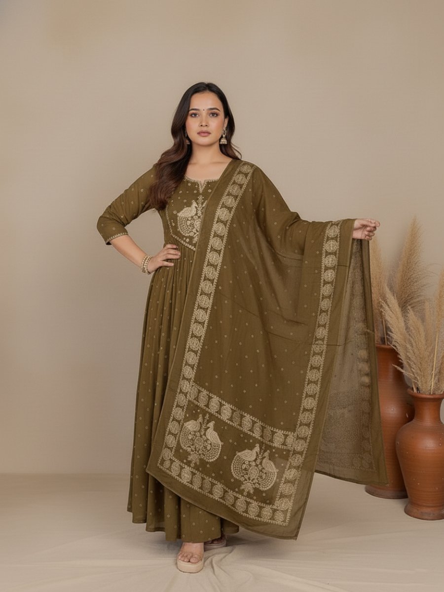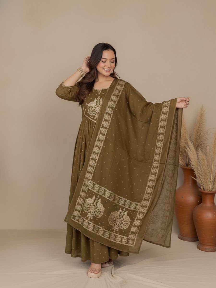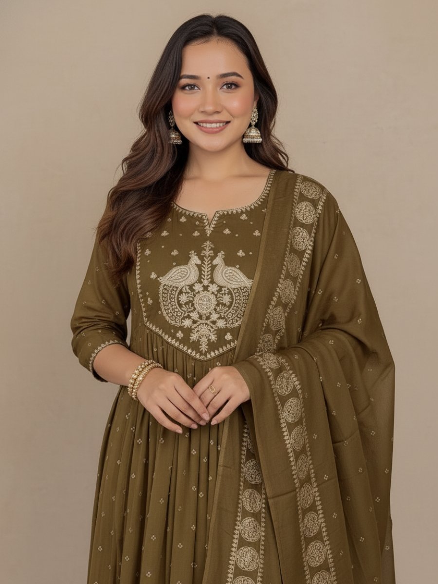 This beautiful set features a flared A-Line/Anarkali Kurti (45+ inches), known for its universally flattering silhouette. The design is elevated by an intricately Embroidered Yoke (featuring traditional motifs like the peacock/paisley), with additional detailing over the sleeves. The set comes paired with a comfortable Pant (38 inches) and a generous 2.1 Mtr Dupatta.