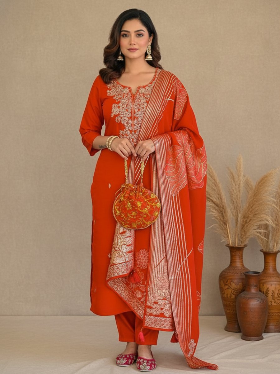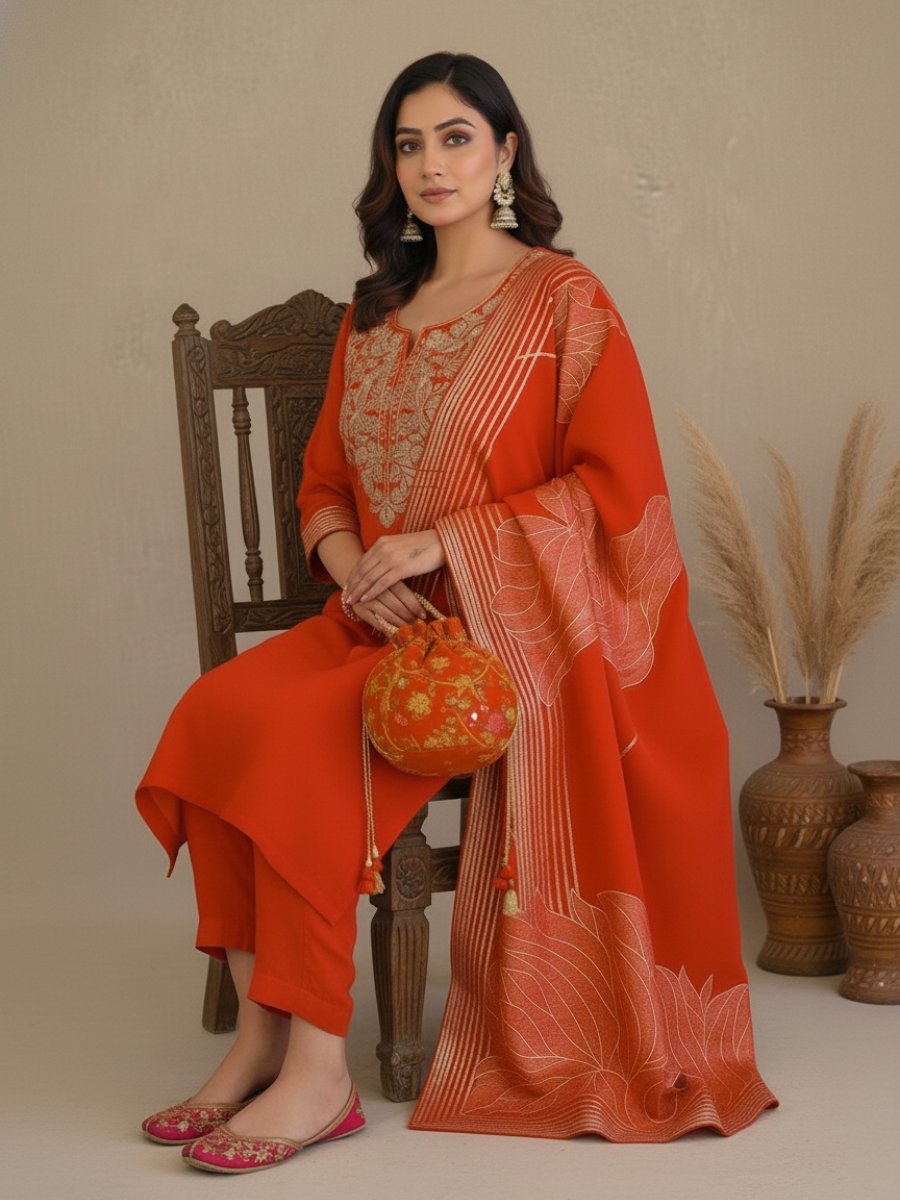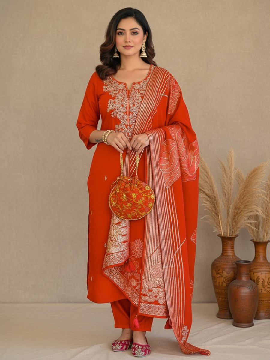 Elevate your festive and wedding wardrobe with this stunning 3-piece embroidered Kurta Set, crafted from premium Heavy Roman Silk. Designed to make a statement, this collection is the ultimate choice for high-profile events during the high-demand season.