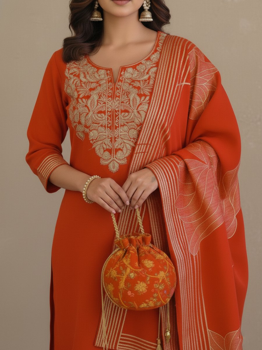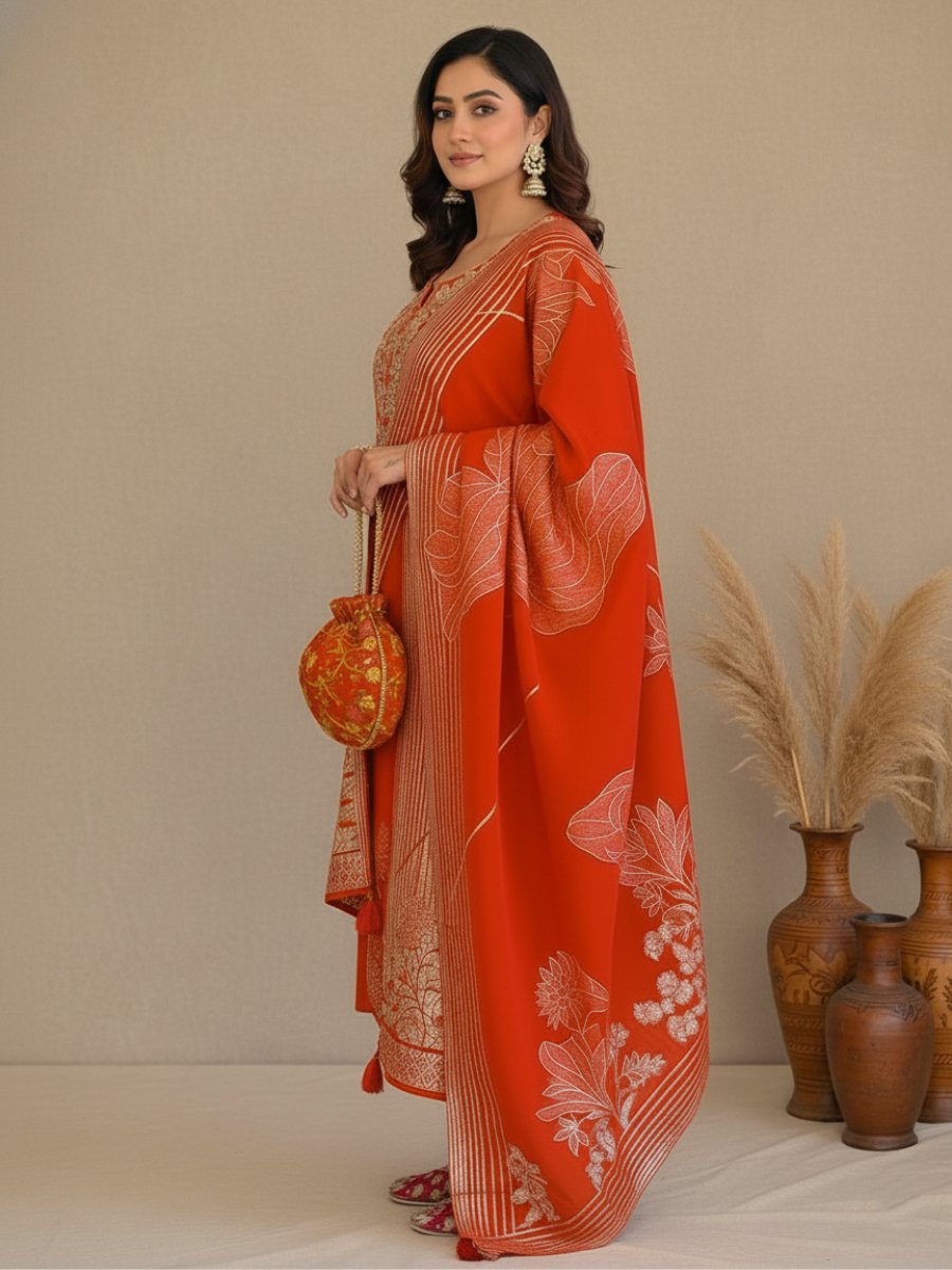 Completing the ensemble is the signature 2.2 Mtr Soft Chanderi Jaquard Dupatta. ‘Jaquard’ is a weaving technique that creates detailed patterns, often resembling Brocade or Banarasi work, which is highly sought after for festive silk suits. The Dupatta adds a traditional, heavy look without excessive weight (the whole suit is only 480 GRM).